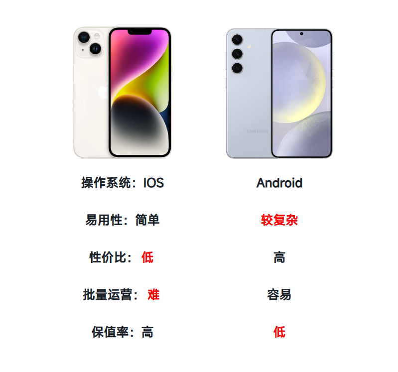 因为首先,苹果手机的参数配置更加简单,机型系统统一,更适合新手快速上手;其次,大部分安卓机型有较高的限制问题等等,比如国产的华为、荣耀机型,在使用谷歌套件和TikTok时,无法保证其稳定性。