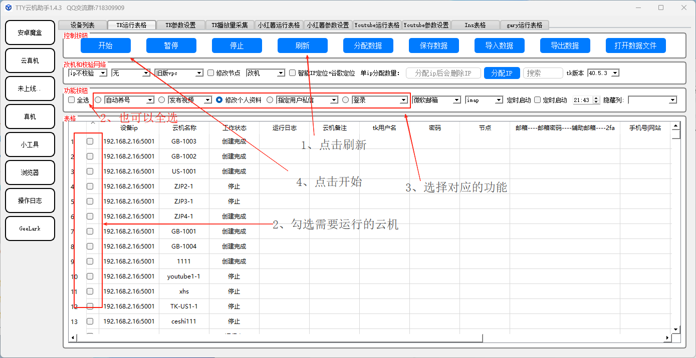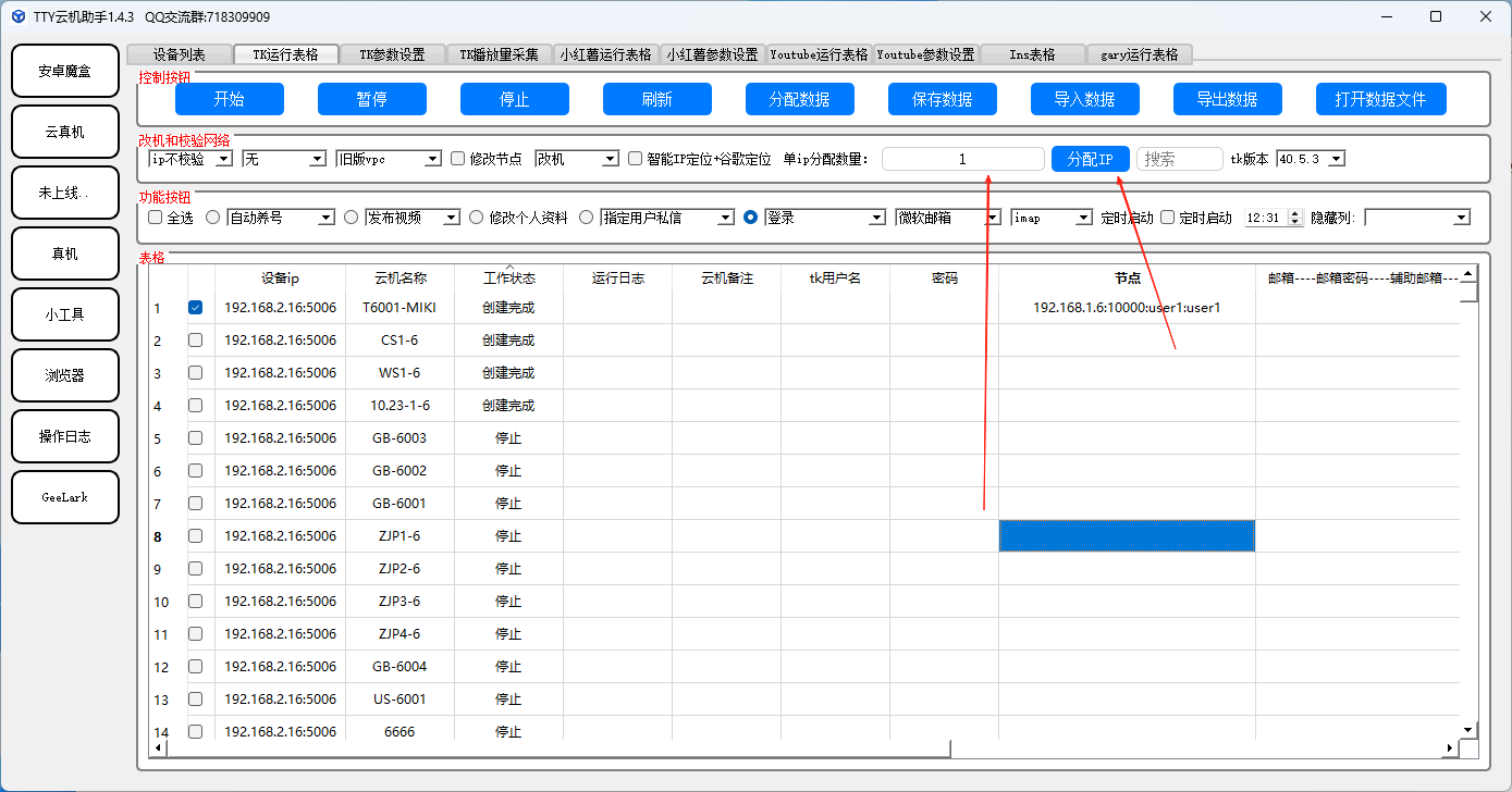 在运行表格中输入一个ip分配给多少个云机,点击分配ip,记得勾选云机,只会分配给勾选了的云机
