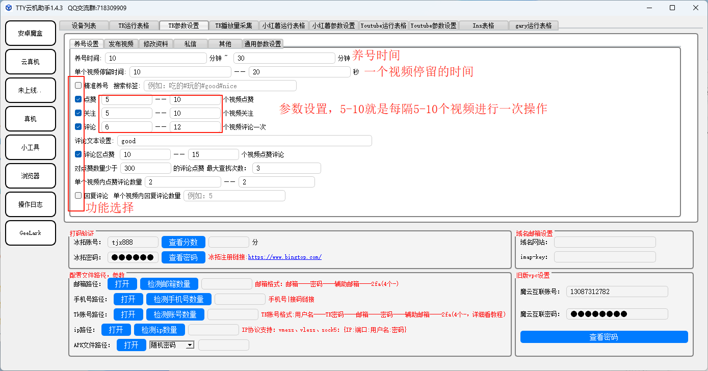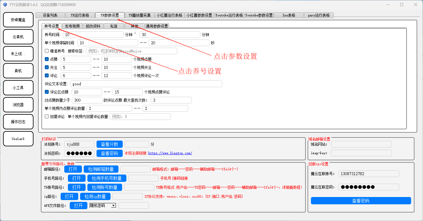 一、刷新云机并勾选养号功能 二、前往tk参数设置中的养号设置 三、勾选需要的功能,并设置参数